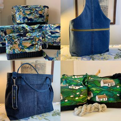 A Juggling Ewe will have handmade project boxec/zipper bags of various sizes and widths made from cotton, canvas, wool, leather, upcycled denim combinations. Denim, canvas, leather tote bags. Knitting accessories - yarn sleeves an dk needle holders - some hand spun yarns and fibres.
